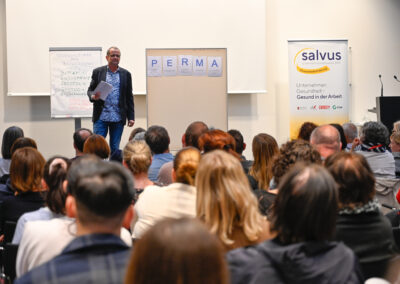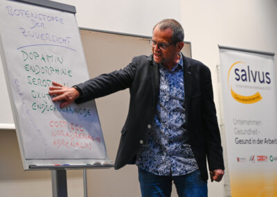 Diesen und weiteren Fragen widmete sich am 8. Mai Bertram Strolz, Psychotherapeut und Gründer der Akademie für Positive Psychologie beim salvus-Unternehmensnetzwerk-Treffen. Ein fesselnder Vortrag, in dem Bertram Strolz das Publikum durch verschiedene emotionale Stadien begleitete und Maßnahmen und Schritte aufzeigte, das Gefühl der Selbstwirksamkeit zu steigern und somit Zuversicht und Wohlbefinden zu erreichen.