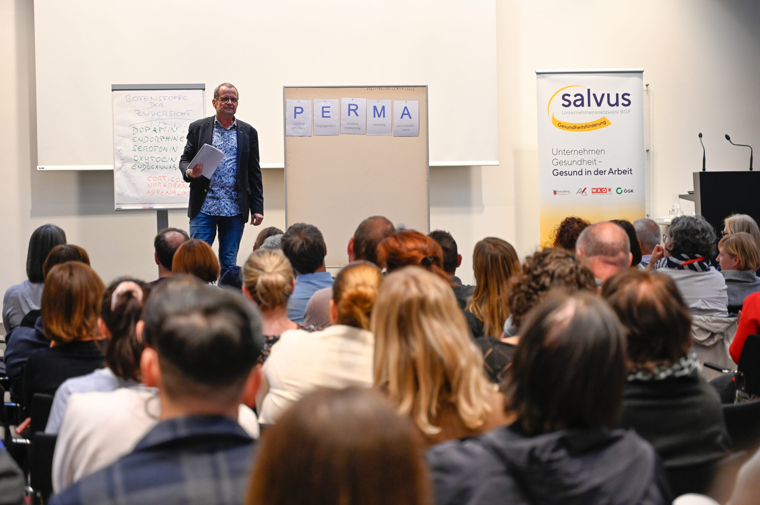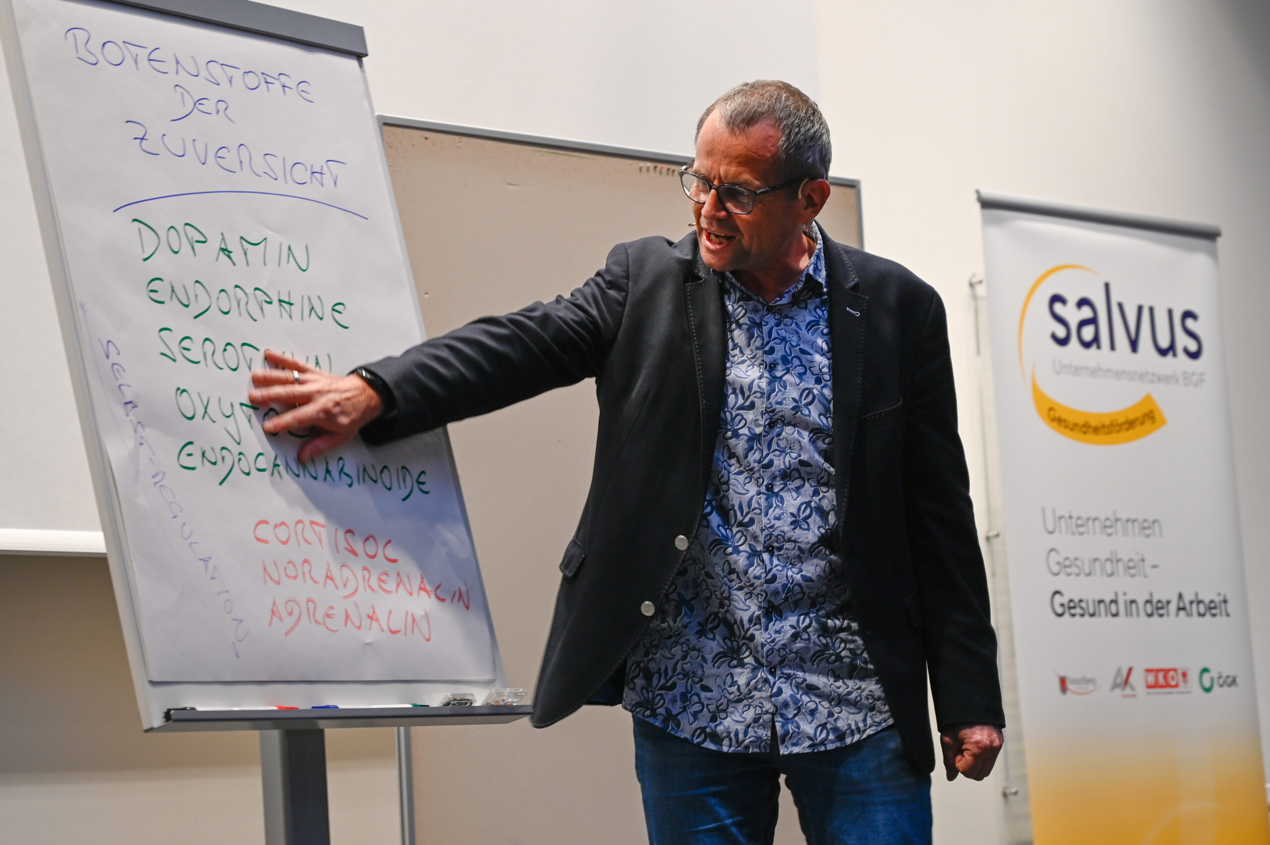Diesen und weiteren Fragen widmete sich am 8. Mai Bertram Strolz, Psychotherapeut und Gründer der Akademie für Positive Psychologie beim salvus-Unternehmensnetzwerk-Treffen. Ein fesselnder Vortrag, in dem Bertram Strolz das Publikum durch verschiedene emotionale Stadien begleitete und Maßnahmen und Schritte aufzeigte, das Gefühl der Selbstwirksamkeit zu steigern und somit Zuversicht und Wohlbefinden zu erreichen.